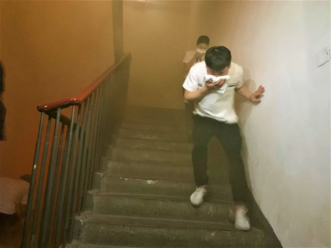 參加疏散演練人員用濕毛巾捂住口鼻防止濃煙侵入,在物業疏散人員引導下,有序地向安全地帶撤離。