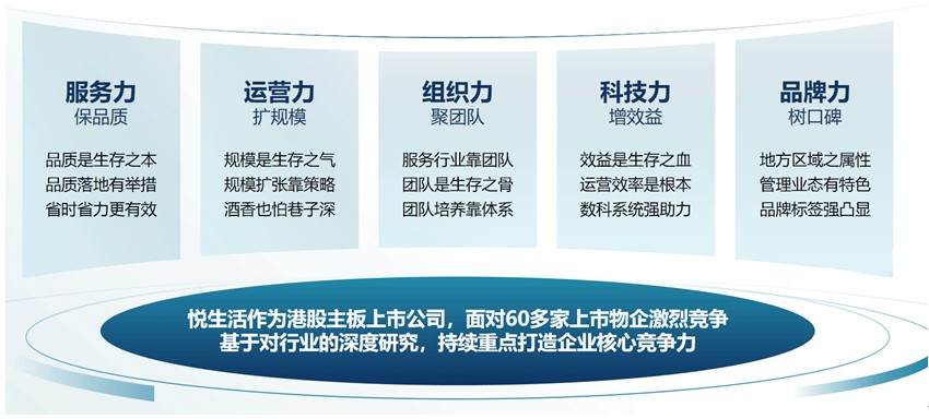 康橋悅生活從對行業的深度研究出發,圍繞客戶需求,持續深入打造企業核心競爭力,并最終歸納為“五力四化”戰略。其中,“五力”分別為服務力、運營力、組織力、科技力和品牌力,五力對應的戰術與內涵涉及到服務品質、規模擴張、高效團隊、數科保障及品牌溢價。視角向內,通過五力打造悅生活核心競爭力以抵抗未來之不確定性及危機。作為服務企業,無形服務有形化是重要核心思想,形成“服務標準化、標準產品化、產品品牌化、品牌價值化”的“四化”格局,保障多業態服務標準、產品封裝,市場競爭能力及品牌溢價。