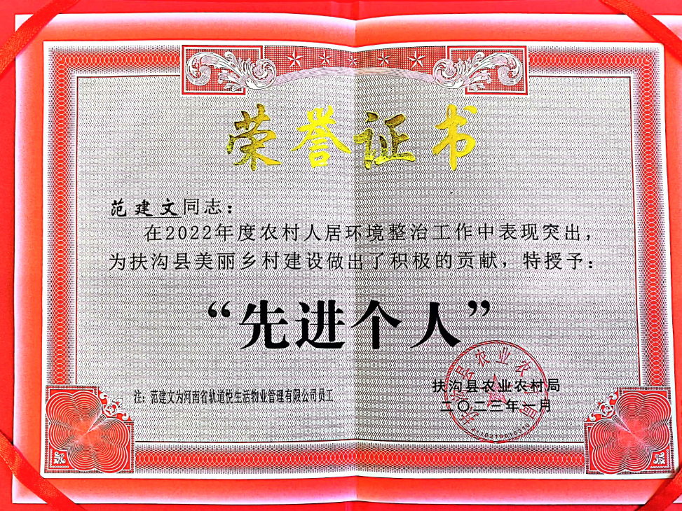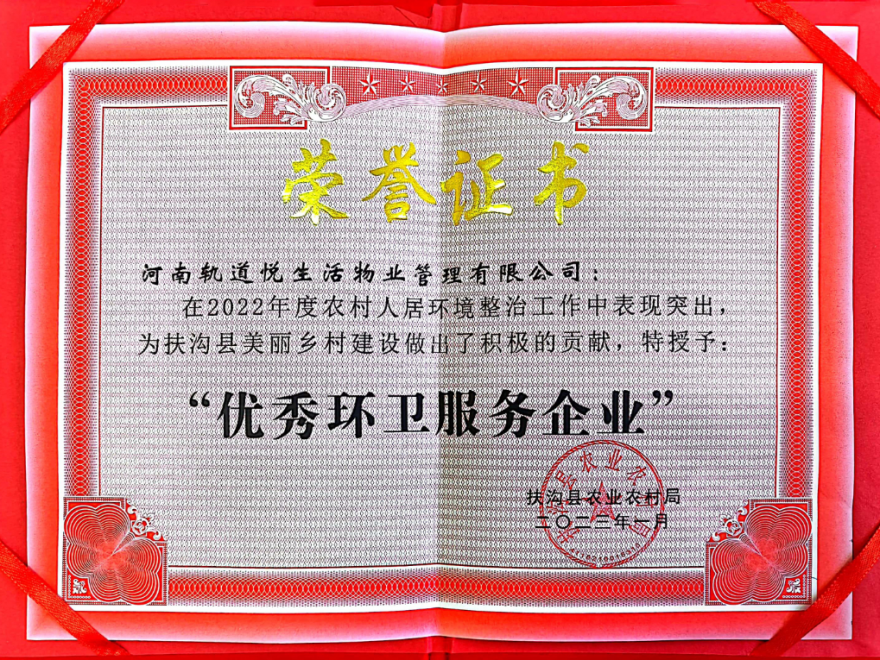 2023年1月,在新春來臨之際,扶溝縣農業農村局授予軌道悅生活“優秀環衛服務企業”榮譽,并授予扶溝環衛服務中心項目負責人范建文“先進個人”的表彰。