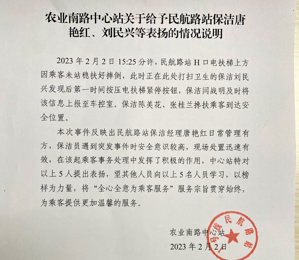 2月2日下午3時左右,地鐵1號線民航路站H口電扶梯上方有一名老人未站穩摔倒,在此處打掃衛生的保潔員劉民興發現后第一時間按下電扶梯緊停按鈕,保潔員閆戰明及時將信息上報車控室,保潔員陳美花、張桂蘭協同攙扶乘客至安全位置,將此次重大安全事故消滅在萌芽狀態。