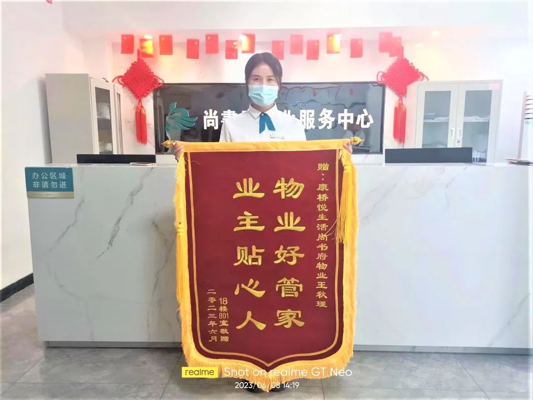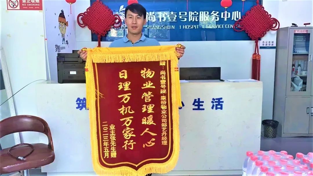 尚書府的業主也給客服管家王秋瑾送來“物業好管家,業主貼心人”的錦旗。原來該業主在外地工作,家里無人看管裝修,王秋瑾全程幫忙,每天都把裝修進展以視頻形式發給業主,期間業主不定時購買的裝修物品都是管家一一配送家中,連家中衛生也都幫忙打掃,業主非常感動。