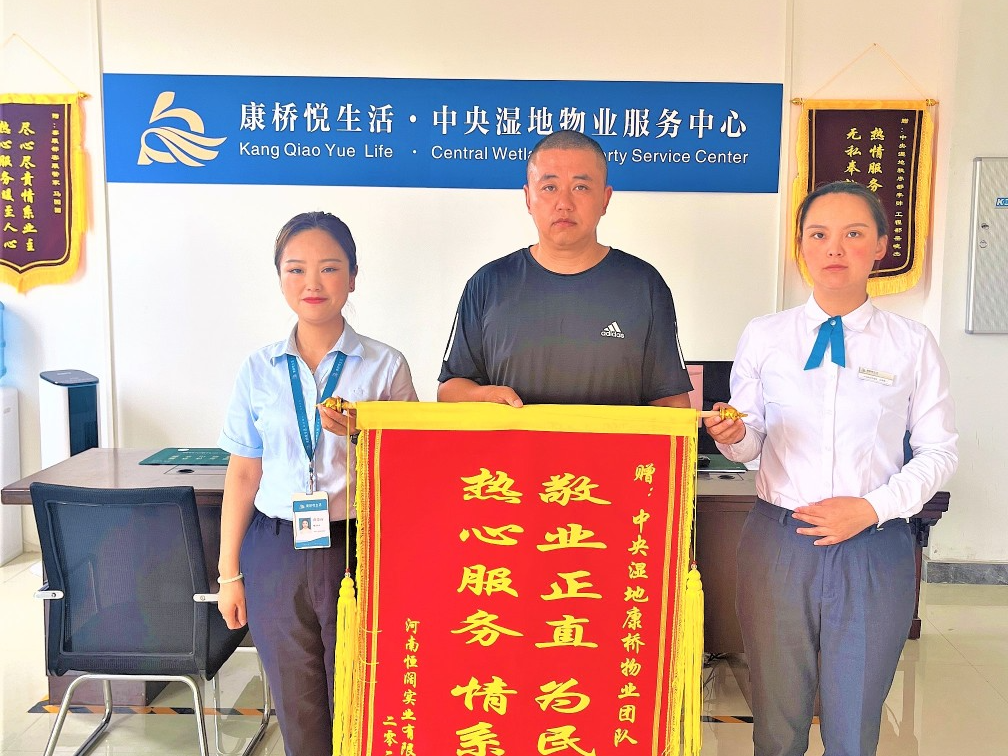 6月7日上午,中央濕地物業服務中心收到施工單位河南恒闊實業有限公司贈送物業團隊“敬業正直·為民解憂、熱心服務·情系業主”錦旗一面。