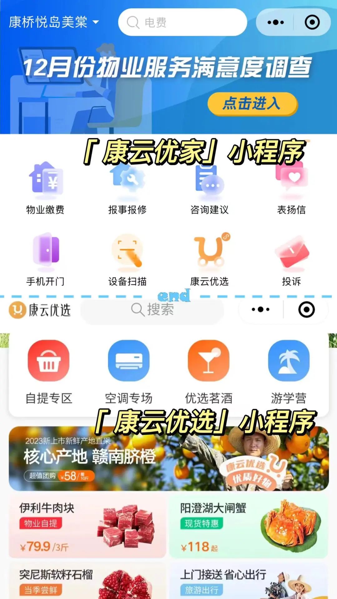 以悅島美棠小區為代表的悅生活智慧服務示范小區,以自研的康云物業服務平臺為基礎,通過康云優家App、康云優家小程序以及康云優選小程序觸達廣大業戶,包含報事報修、工程巡檢、生活用品采購、鄰里溝通互動、在線繳費、家政服務等功能,極大的滿足了業戶生活所需,為其提供高效率、高質量的物業服務。