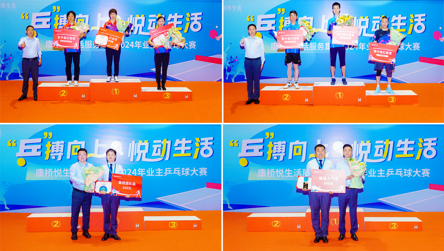在經過小組賽、淘汰賽、冠亞軍爭奪賽等激烈比拼之后,來自康橋悅生活服務集團鼎峰物業公司美林上苑項目的寧俊杰、北部戰區明德園項目的吳廣梅、康橋悅生活服務集團立豐物業公司昆明時光項目的李聞山分別斬獲女子組冠亞季軍,來自北部戰區河大專家公寓項目的張堃浩和扈元科、南部戰區九溪郡項目的夏法平分別斬獲男子組冠亞季軍。此外北部戰區榮獲最佳團隊獎,北部戰區北三片區榮獲最佳人氣獎。
