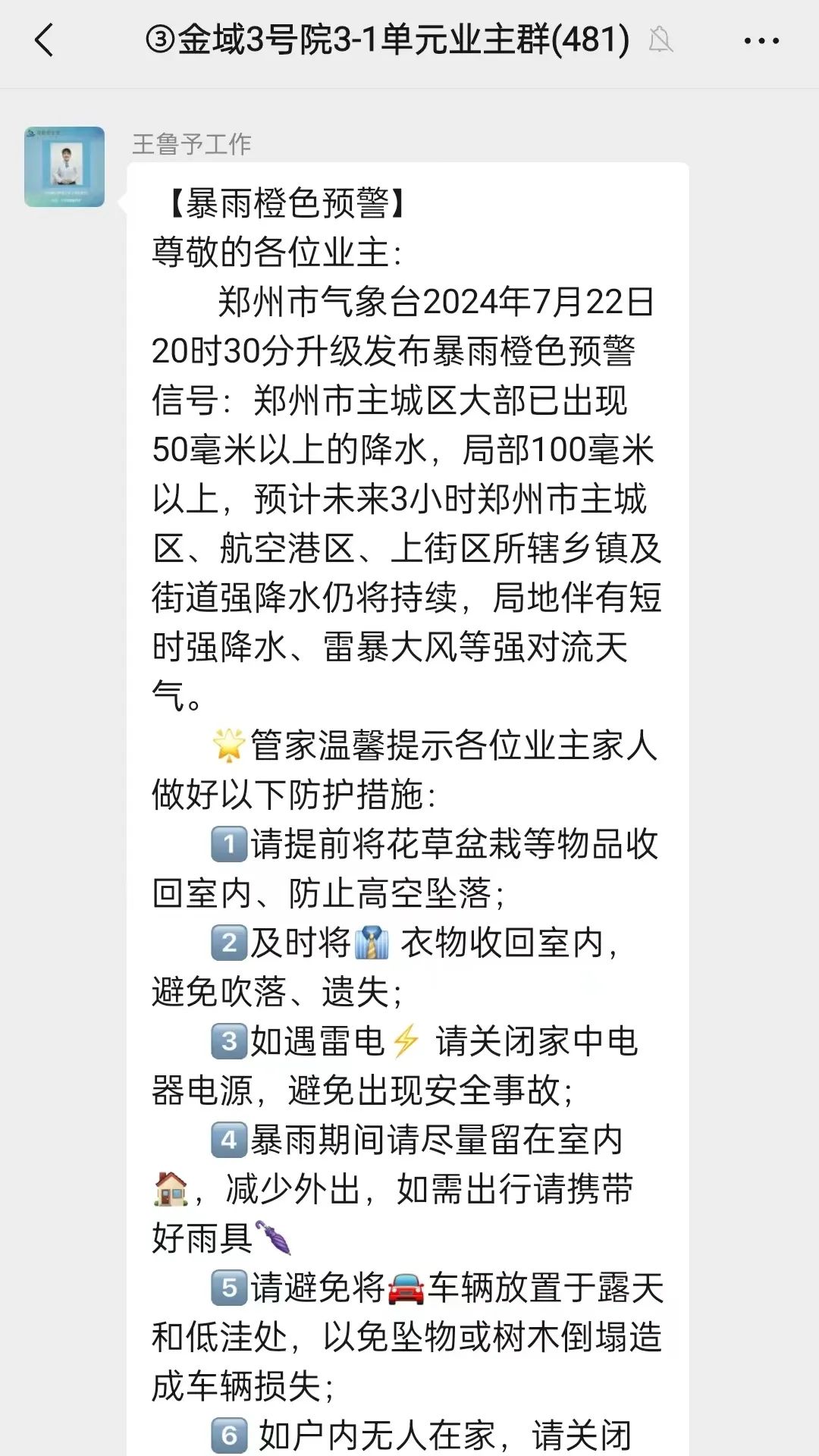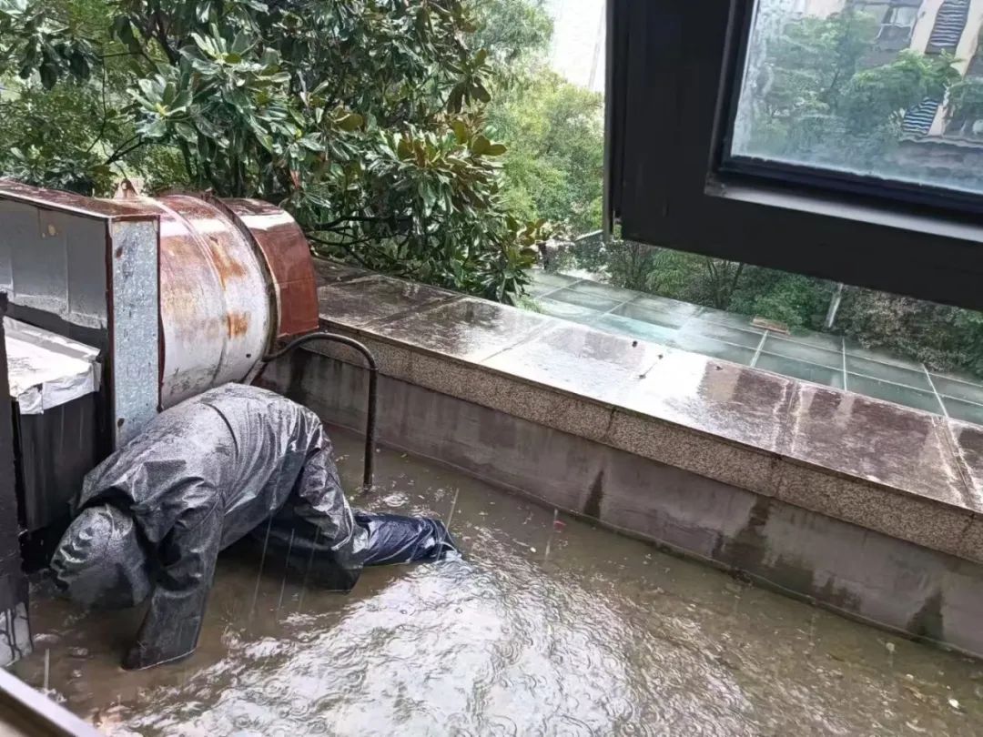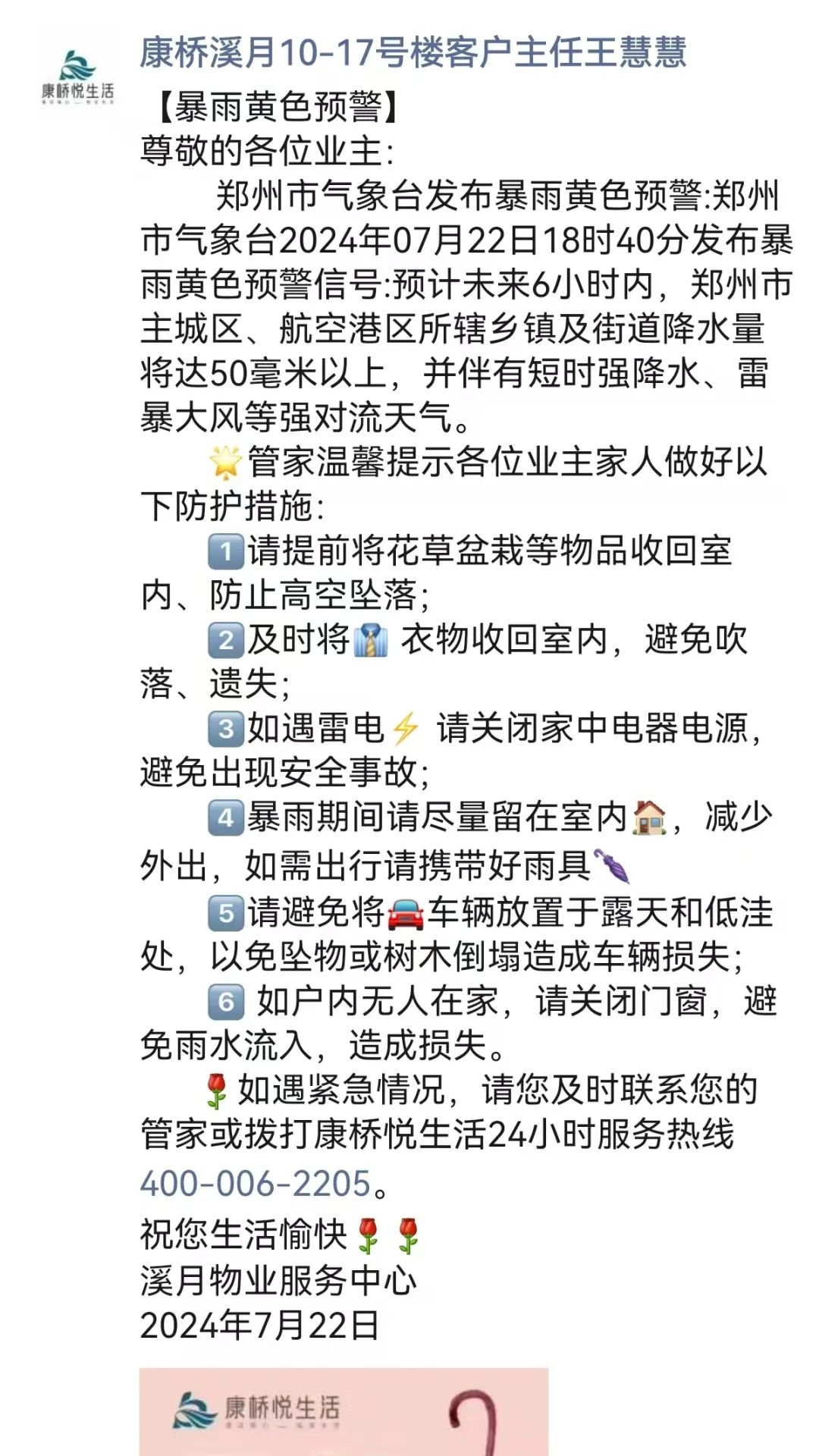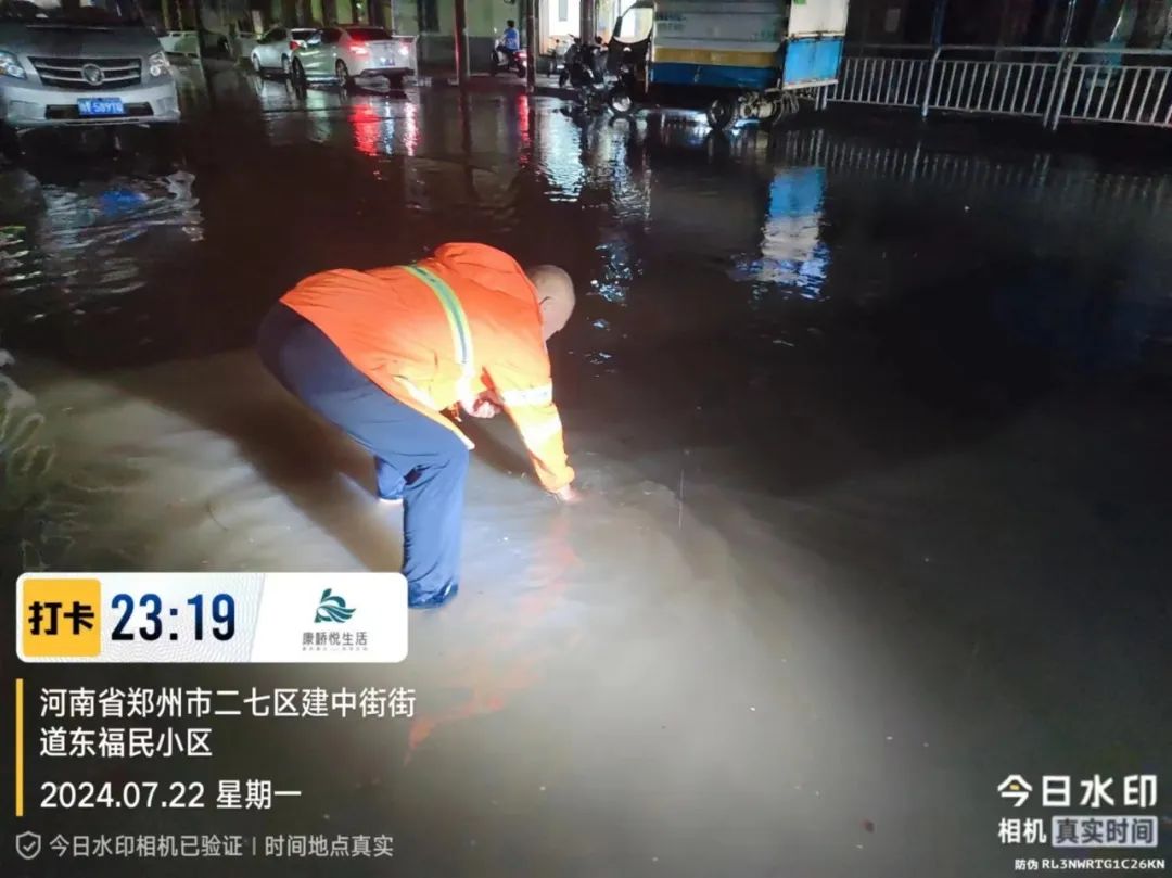 暴雨天氣路面積水嚴重,為了保障道路通暢,康橋悅生活各戰區、合資公司物業人不間斷巡查,及時疏通排水管道、排除積水,檢查路面車輛門窗關閉情況,盡全力保障業主的生命財產安全。