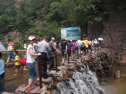 大家一下車便被龍潭峽的風景所吸引,一起在景區門口合影留念后,便在導游的帶領下,進入龍潭峽景區游覽。走進龍潭峽,我們看到了罕見的“水往高處流”奇觀、鬼斧神工的“石上天書”、神奇無比的“絕世天碑”、神秘莫測的“仙人足跡”……親臨其境的體驗了這道由自然鬼斧神工造就的“美麗的傷痕”。一個個奇觀異景,像是在向我們述說著這條神秘峽谷形成的傳奇故事!