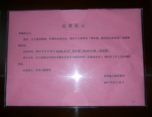晾曬衣物一直是困擾高層住宅小區住戶們的一大難題,為提倡健康、幸福的品質生活,康橋溪山御府物業服務中心在8月18日舉辦了以“曬健康,曬出陽光好味道”為主題的初秋晾曬活動,希望通過此次活動,讓業主深切感受到物業服務的周到和社區的和諧。