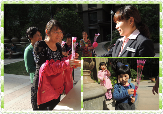 送鮮花,傳愛意,做游戲!2014年的母親節,康橋金域上郡2號院的業主們度過了一個幸福溫馨的母親節。原來這天下午,由康橋金域上郡2號院物業服務中心特別策劃的“濃情母親節·大聲說出愛”母親節社區活動在園區八角亭隆重舉行。園區30多位女性業主和帶著孩子參與了此次活動。