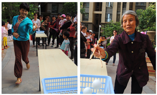 獻花活動結束后,接下來便是緊張激烈的“筷子夾乒乓球”游戲,游戲分為大人組和小朋友組,6個人分為3組比賽,每組的第一名可以獲得物業服務中心贈送的小禮品一份。小朋友們、大人們、老人們都積極參與,場面十分活躍有趣,時不時傳來大家的陣陣歡笑聲。