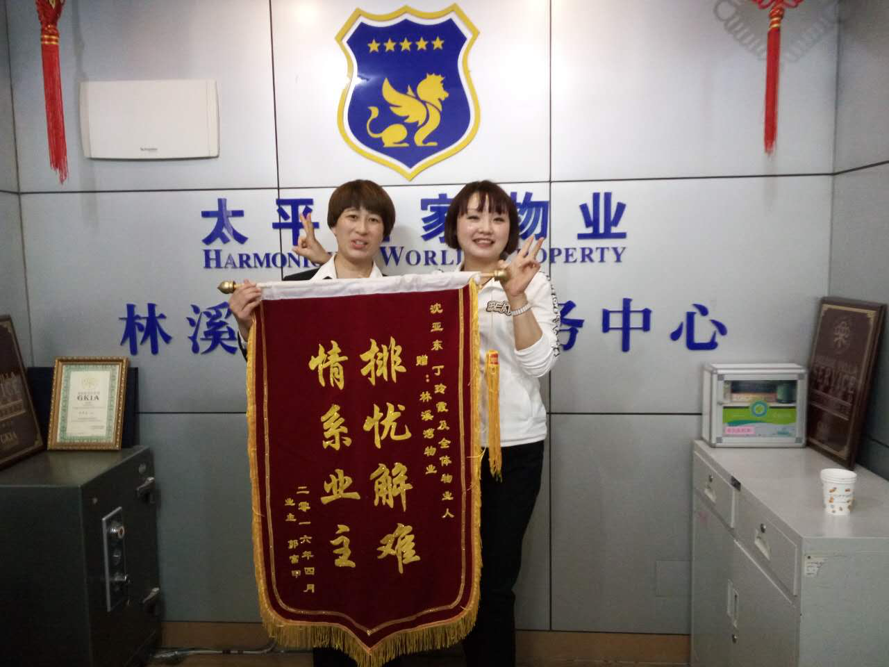 2016年4月19日康橋林溪灣物業服務中心收到來自80幢樓郭女士送來的錦旗一面:排憂解難 情系業主。